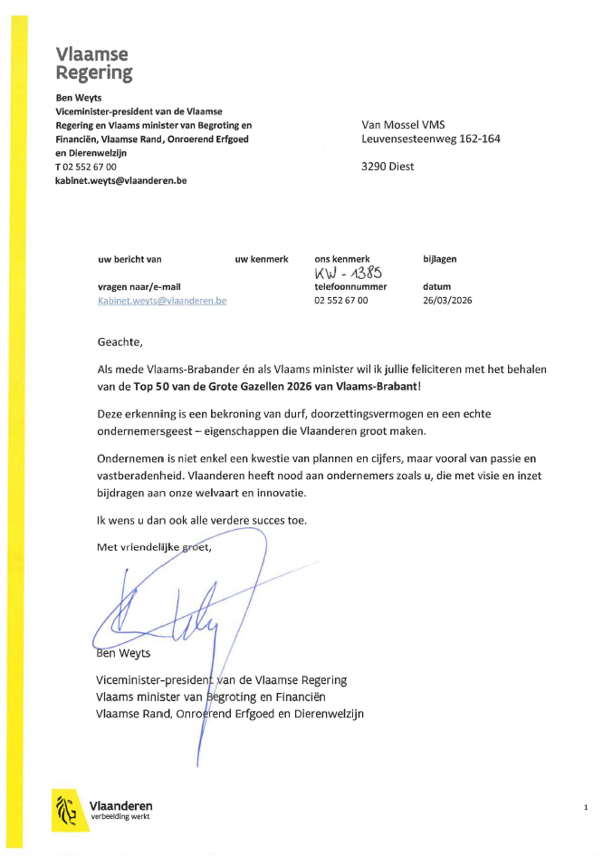 Recent ontvingen we een brief van de Vlaamse Regering met een mooie erkenning: een plaats in de Top 50 van de Grote Gazellen 2026 van Vlaams-Brabant.